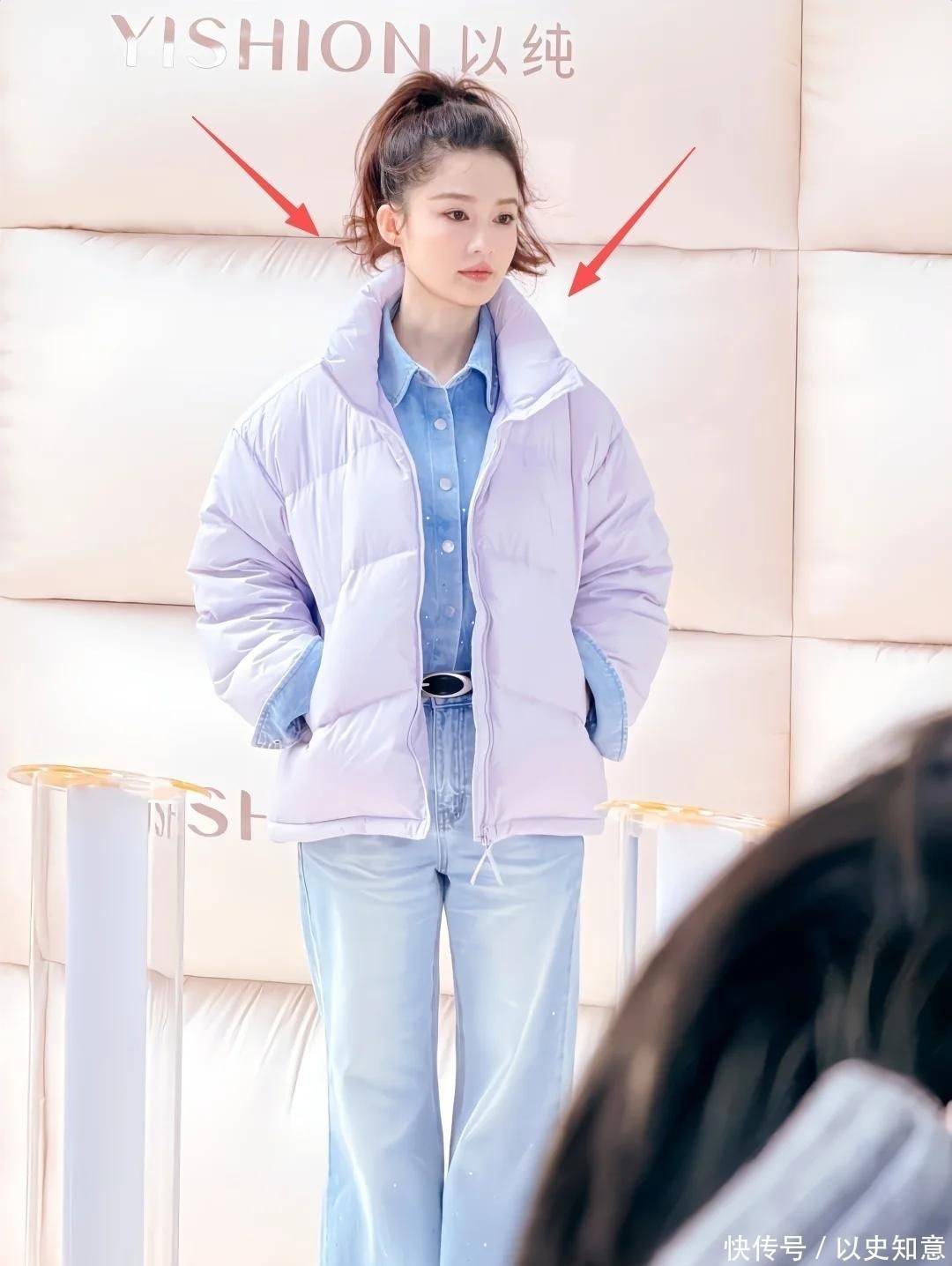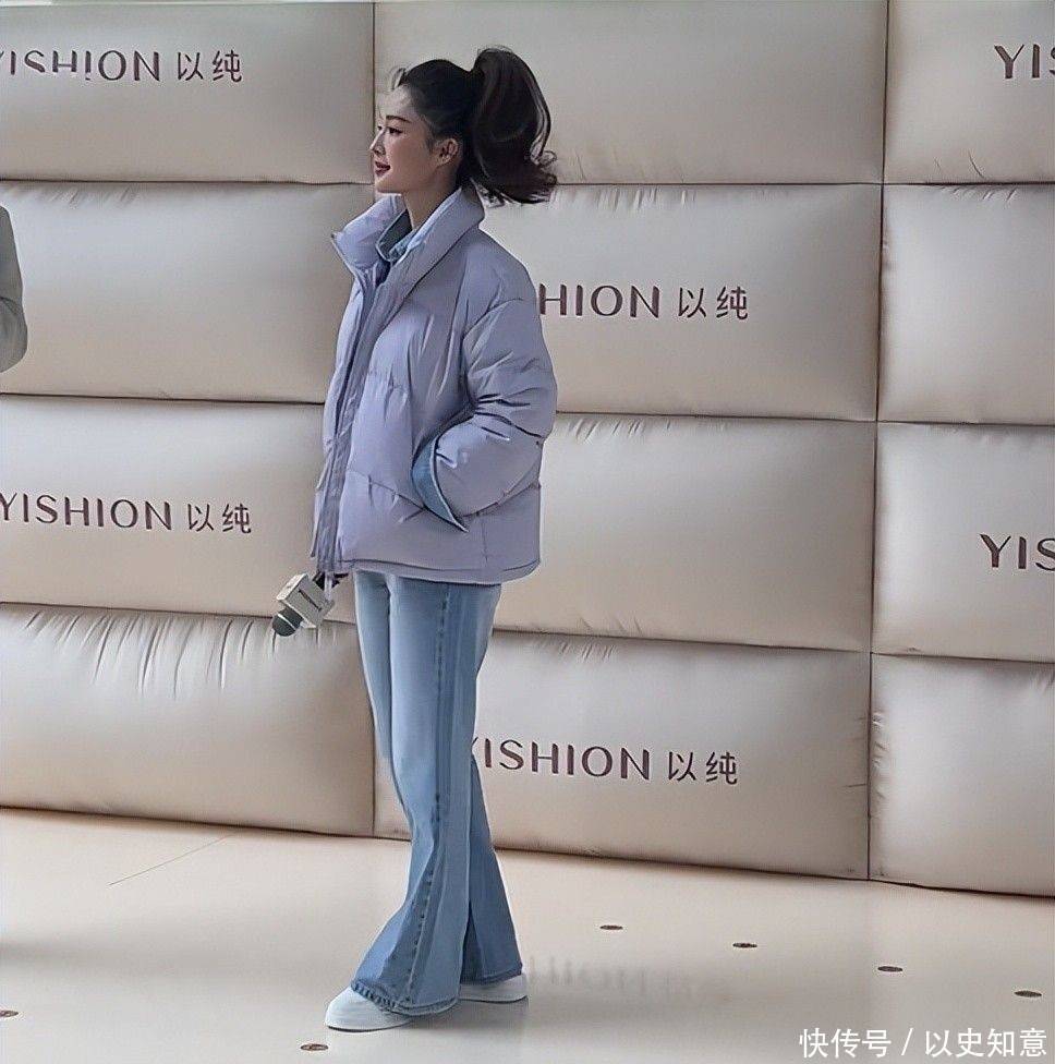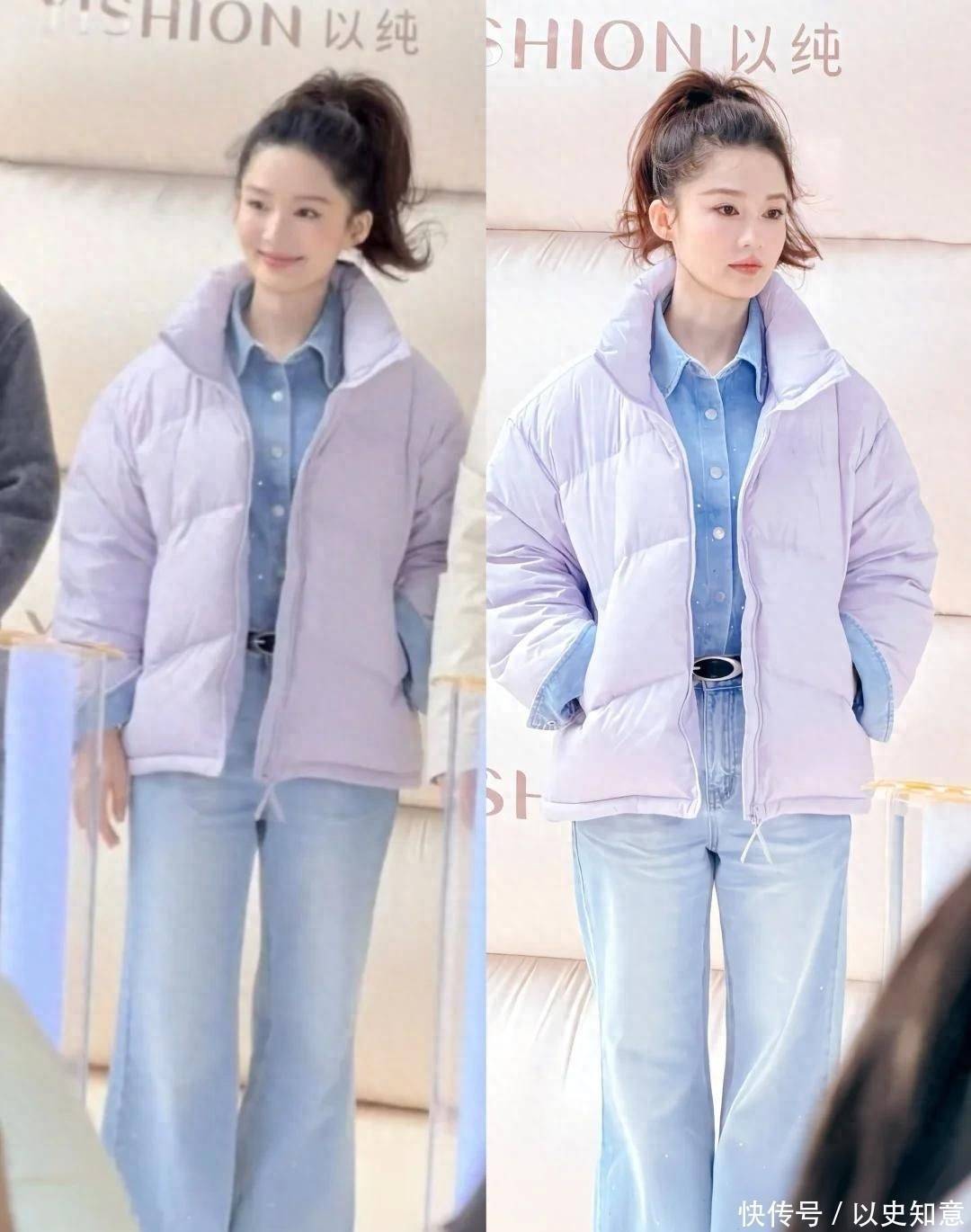 先来看看这组引爆社交平台的穿搭——短款紫羽绒服搭配蓝色牛仔衬衫,下半身是高腰直筒牛仔裤,腰间一条黑色细皮带精准划分黄金比例,视觉上直接拉长腿部线条,宛如漫画中的少女身材。 最点睛的是那个高耸挺立的马尾辫,扎得一丝不苟又不失俏皮,发尾特意留了几缕碎发随风轻扬,灵动中带着几分青春气息。